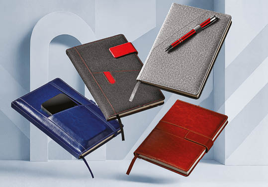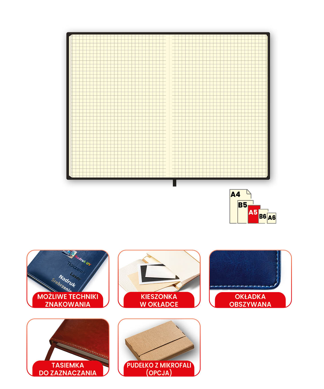 Notatniki w twardych, obszywanych oprawach na tekturze z gąbką, zaopatrzone w praktyczne dodatki: kieszenie, klamry, uchwyty i gumy zamykające. Okładka z zaokrąglonymi rogami posiada dwie wewnętrzne kieszenie na dokumenty. Blok kremowy w kratkę z tasiemką do zaznaczania. Termoprzebarwialna oprawa, umożliwia wykonanie tłoczenia matrycą, personalizacji laserowej i nadruków. Brak stopki wydawniczej.